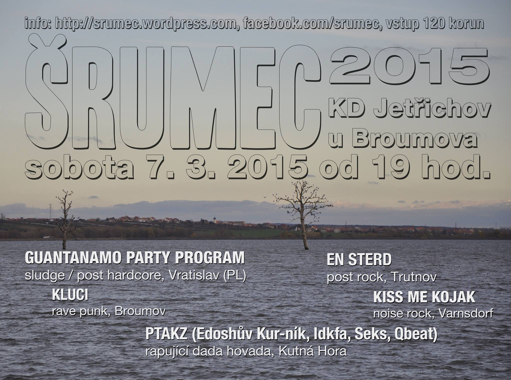 V sobotu 7. března 2015 zahrají v Kulturním domě v Jetřichově u Broumova na Šrumci 2015 Kiss Me Kojak, Guantanamo Party Program, Ptakz, Kluci a En Sterd.