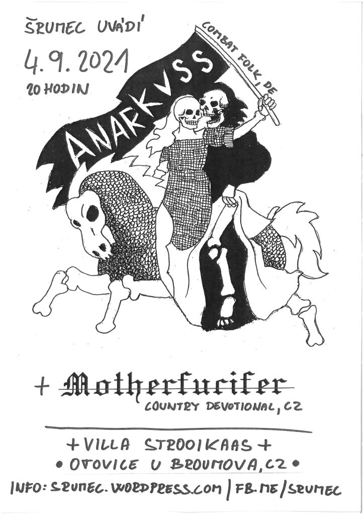Prázdniny budou brzy za náma a můžeme tak navázat tam, kde jsme na jejich začátku skončili – ve Ville Strooikaas v Otovicích. V sobotu 4. září 2021 se můžete přijet vystavit na poslední sluneční paprsky letošního léta a večer si poslechnout Anarkuss a Motherfucifer. Dvě dua, která možná na první pohled vypadají docela nenápadně, ale uvnitř… no však uvidíte.