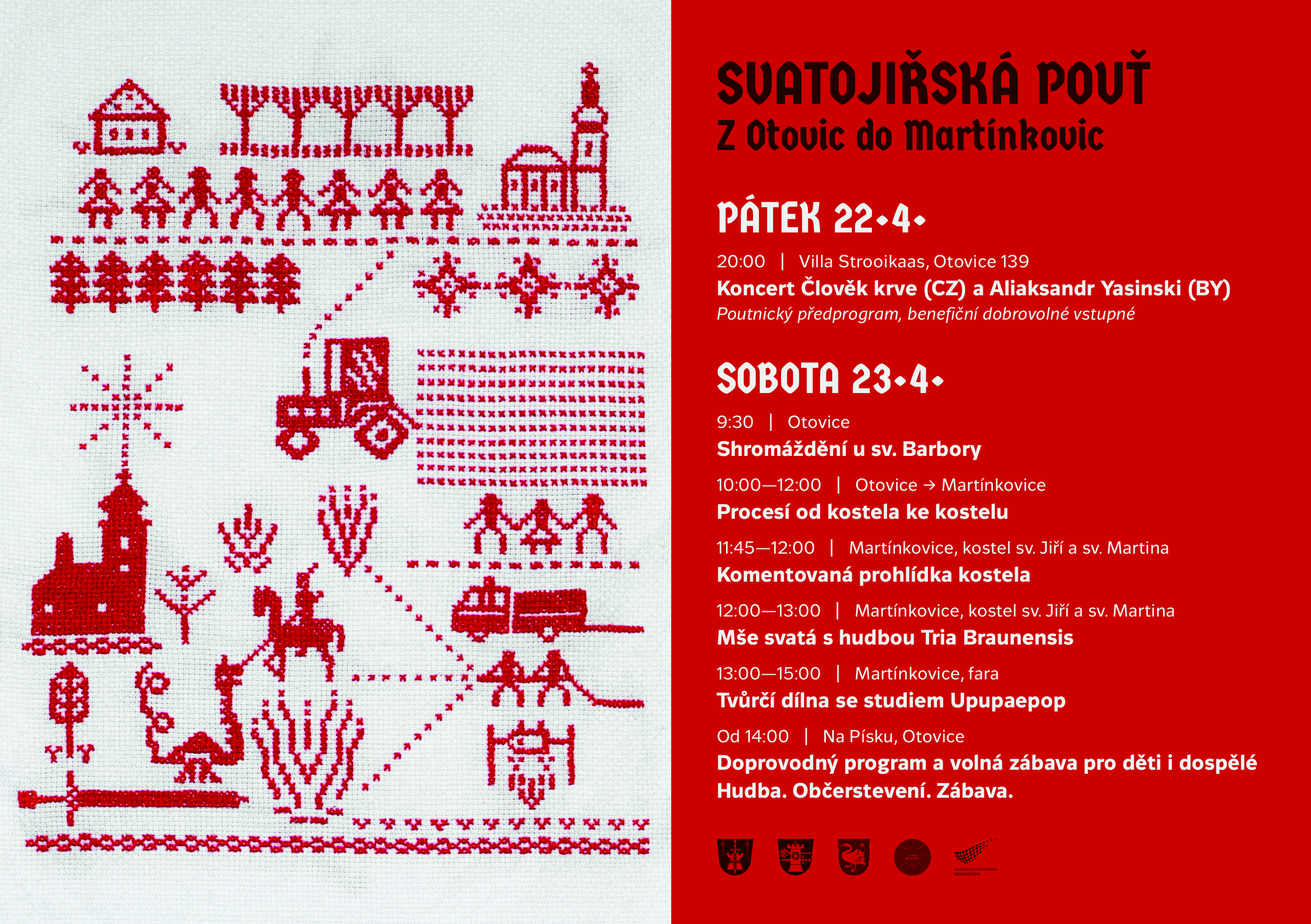 Stalo se, že parta nadšenců se rozhodla znovuobnovit tradici Svatojiřské pouti z Otovic do Martínkovic. Přestože nejsme poutníci klasického stylu, rozhodli jsme se tuhle vesnickou událost podpořit a pro poutníky z daleka i blízka pořádáme v pátek večer předprogram. Ve Ville Strooikaas v Otovicích zahrají Člověk krve a Aliaksandr Yasinski.