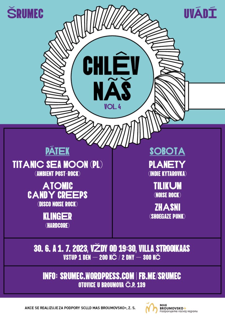 Kapely jsme rozložili tři na tři. V pátek tak můžete slyšet Klinger, hardcorovou nakopávačku z nedalekých měst a vsí. Za mikrofonem uvidíte Zdendu, kterého si na chvíli půjčili Decultivate, ale už je zpět doma. Pořádně hlučnou noisovou diskotéku odstartují Atomic Candy Creeps, v jejichž řadách uvidíte muzikanty z At Bona Fide a dalších profláklých kapel ostravské scény. Hřebíkem večera budou polští Titanic Sea Moon ze Słupsku. Uslyšíte, do jakých snových vod post-rocku a ambientu můžou doplout chlapíci, kteří doslova stavěli polskou hardcore-punkovou scénu v kapelách jako Guernica Y Luno nebo Ewa Braun.