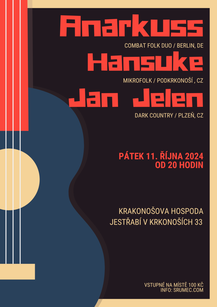 Naše pořadatelská chobotnice roztahuje chapadla, do područí se nám dostávají Krkonoše. Kde jinde začít, než přímo v Krakonošově hospodě! Do tohohle podniku v Jestřabí v Krkonoších (č. p. 33) přijedou v pátek 11. 10. 2024 Anarkuss, Hansuke a Jan Jelen.