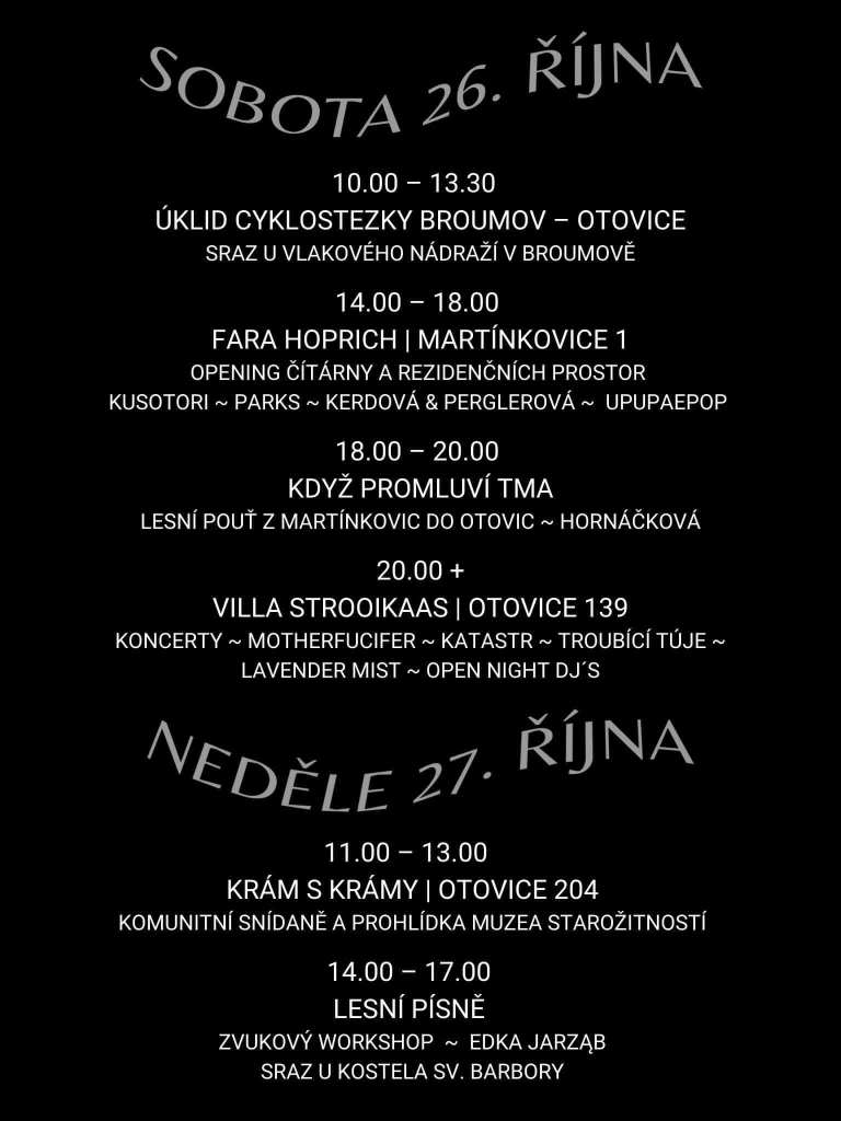 Ve spolupráci s Hoprichem pořádáme tuhle výjimečnou akci, na kterou jsme ale přispěli celkem obyčejně a tak, jak to máme rádi – pozvali jsme čtyři kapely do chlívku Villy Strooikaas v Otovicích. V sobotu 26. října 2024 si tak na jednom místě můžete poslechnout Katastr, Lavender Mist, Motherfucifer a Troubící túje. Doporučujeme ale i zbytek programu.