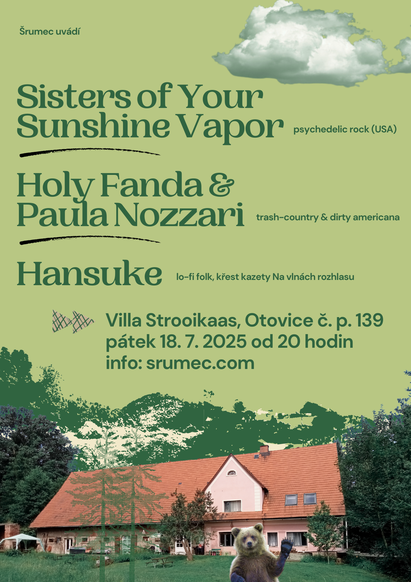 Ani horká fáze léta u nás není letos klidnější. V pátek 18. července 2025 se v otovické Ville Strooikaas uskuteční večírek hned se třemi vystupujícími. Úplně na poslední chvíli se k nám připojují američtí psychedelici Sisters of Your Sunshine Vapor, kteří doprovodí původně plánované Hansuke a Holyho Fandu s Paulou Nozzari.